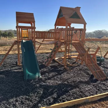 Converted 1/3 of lower yard (28'x44') into playground & trampoline space. Covered with 4 pallets of brown colored mulch and trimmed with stained timbers. Playground is a hand-me-down from a friend that we sanded and stained. Some new accessories (swings, rope ladder) and a sandbox rounded out the refurb effort. In hindsight, I should have trimmed with taller timbers (6x6) and put down more than the 3 inches of mulch to keep grass from growing in the mulch (even though a grass/weed block barrier was put down before). Still quite pleased and the kids all love it.